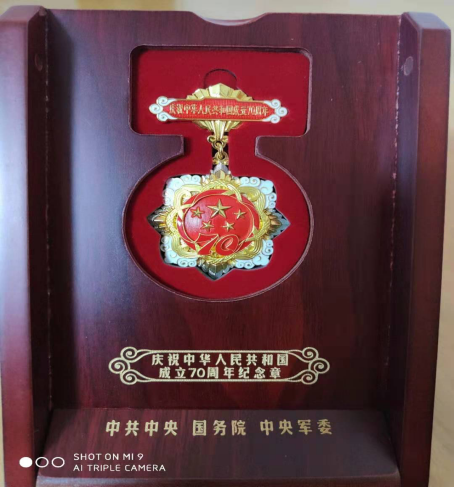 在新中國成立70周年之際,中共中央、國務(wù)院、中央軍委決定頒發(fā) “慶祝中華人民共和國成立70周年”紀(jì)念章。紀(jì)念章使用銅胎鍍金材質(zhì),主要元素為五星、“70”飄帶、團錦結(jié)、如意祥云和光芒,主色調(diào)為紅色和金色。核心部分為五星,代表國家榮譽。“70”飄帶象征中華人民共和國70年奮斗歷程。團錦結(jié)環(huán)繞在五星和“70”飄帶周圍,寓意全國各族人民大團結(jié),構(gòu)建人類命運共同體的愿景。章體外環(huán)以如意祥云、光芒構(gòu)成,象征人民對美好生活的向往,同時表達隆重慶祝中華人民共和國生日,禮贊國家富強、民族振興、人民幸福的輝煌成就,以及在70年輝煌奮斗成就的基礎(chǔ)上不忘初心、繼續(xù)前進的堅定決心。