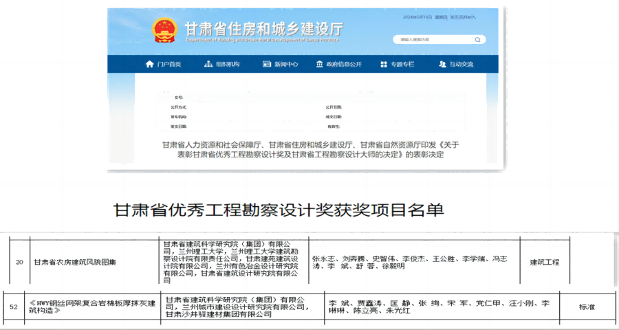 近日,甘肅省人力資源和社會(huì)保障廳、甘肅省住房和城鄉(xiāng)建設(shè)廳、甘肅省自然資源廳公布了2023年度甘肅省優(yōu)秀工程勘察設(shè)計(jì)獎(jiǎng)提名獲獎(jiǎng)項(xiàng)目名單,甘肅建科院2個(gè)項(xiàng)目獲獎(jiǎng)。