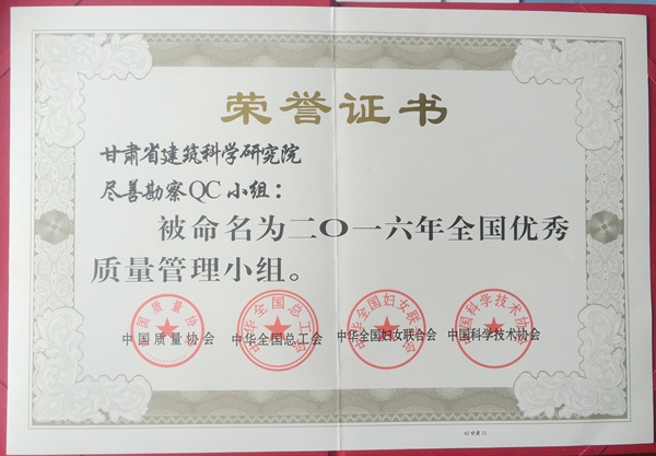 全國第三十八次質(zhì)量管理小組代表會議于2016年9月20日在浙江省嘉興市召開。會上,由甘肅省建筑科學(xué)研究院勘察分院盡善勘察小組申報的《提高重型動力觸探試驗準確率》成果,被甘肅省質(zhì)量協(xié)會推薦為全國優(yōu)秀QC小組成果,并被中國質(zhì)量協(xié)會、中華全國總工會、中華全國婦女聯(lián)合會和中國科學(xué)技術(shù)協(xié)會聯(lián)合授予“二〇一六年全國優(yōu)秀質(zhì)量管理小組”。